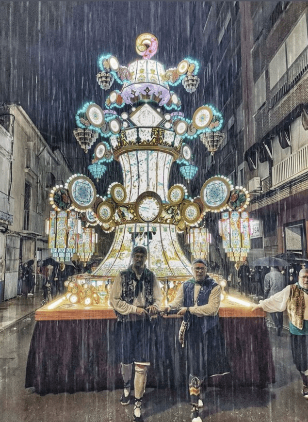 Los primeros entes festeros encontraron en medio de una intensa lluvia un palco marcado por la ausencia de la alcaldesa Amparo Marco y el concejal de fiestas Omar Braina. Ambos habían participado en la tornà de la romería que finalizaba en la calle Sanahuja, en el mismo lugar en el que se daba inicio el desfile de gaiatas y comenzaba poco después.