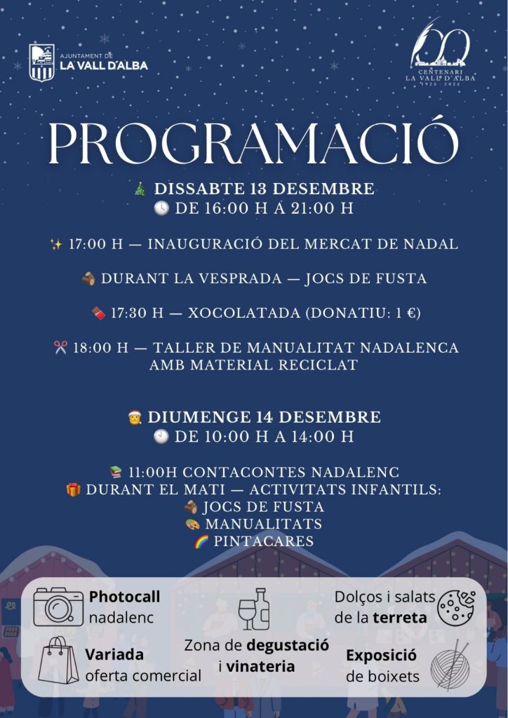 “Queremos que los más pequeños vivan estos días con la ilusión propia de estas fechas, y que las familias encuentren en el Mercat de Nadal un punto de encuentro y diversión compartida”, ha añadido la alcaldesa de Vall d’Alba.