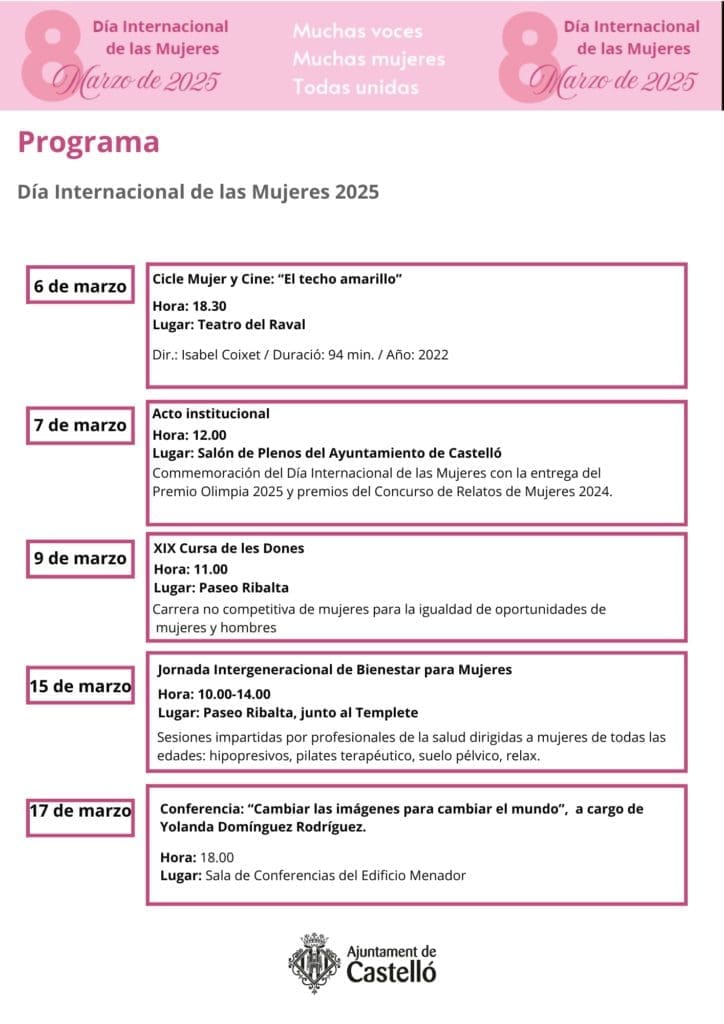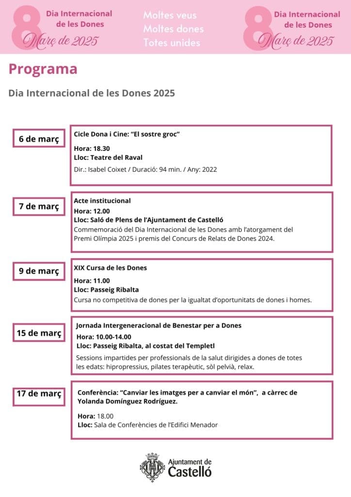 Asimismo, la primera edil ha destacado dentro de los actos programados para conmemorar el Día Internacional de la Mujer, el Premio Olimpia en reconocimiento a la gran aportación de mujeres en materia de igualdad en la ciudad de Castellón, así como la novedad este año, con la celebración de una jornada intergeneracional de mujeres y la Cursa de la Dona, en la que se prevé se superen las 4.000 participantes.