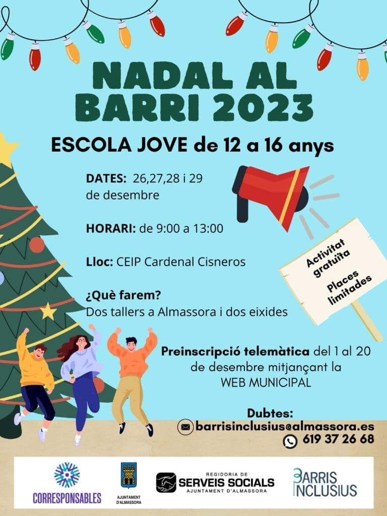 El Ayuntamiento de Almassora apuesta por el ocio juvenil y pedagógico con la apertura de la Escola Nadal al Barri totalmente gratuita. Se trata de una iniciativa puesta en marcha por primera vez por la Concejalía de Servicios Sociales.