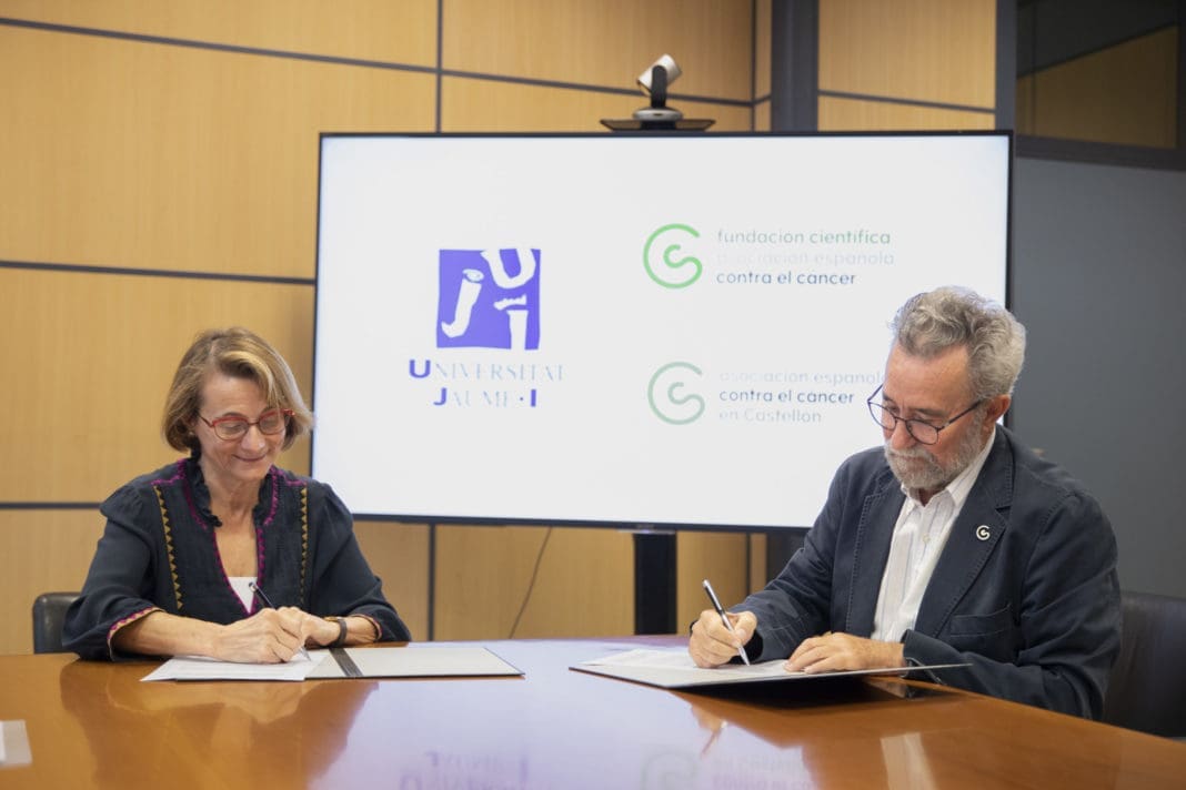 La rectora de la UJI, Eva Alcón, acompañada por el vicerrector de Investigación, Jesús Lancis, la co-directora de la tesis, la profesora M. Ángeles Marqués y la doctoranda Elvira Carbonell, ha firmado un convenio de colaboración empresarial con el presidente la Asociación Española contra el Cáncer de Castelló, Carlos Ulldemolins, quien estaba acompañado por la gerente provincial de la asociación, Salomé Esteller y la psicóloga de Prevención, María Valero.