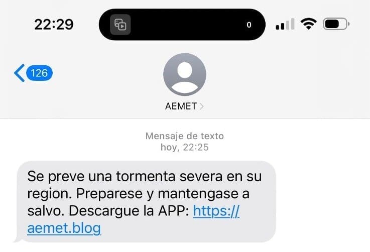 Los estafadores están aprovechando esta situación para difundir estos mensajes falsos, apelando al miedo y la urgencia para que los usuarios caigan en la trampa. El mensaje fraudulento afirma que «se prevé una tormenta severa en su región», seguido de la recomendación de «prepararse y mantenerse a salvo», lo que induce al receptor a hacer clic en el enlace proporcionado.