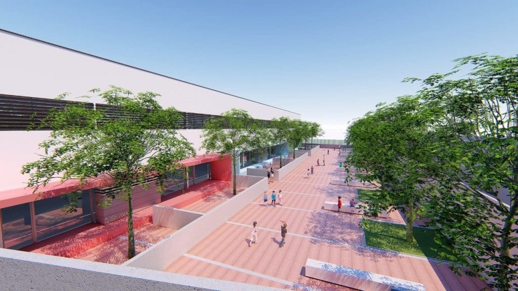 El punto de unión entre el edificio antiguo y el nuevo genera un espacio en la planta inferior de Infantil, bajo el paso de un edificio a otro que es aprovechado para generar un patio cubierto para Infantil. El nuevo edificio se emplazará en un solar anexo, de 2.600 metros cuadrados, de propiedad municipal.