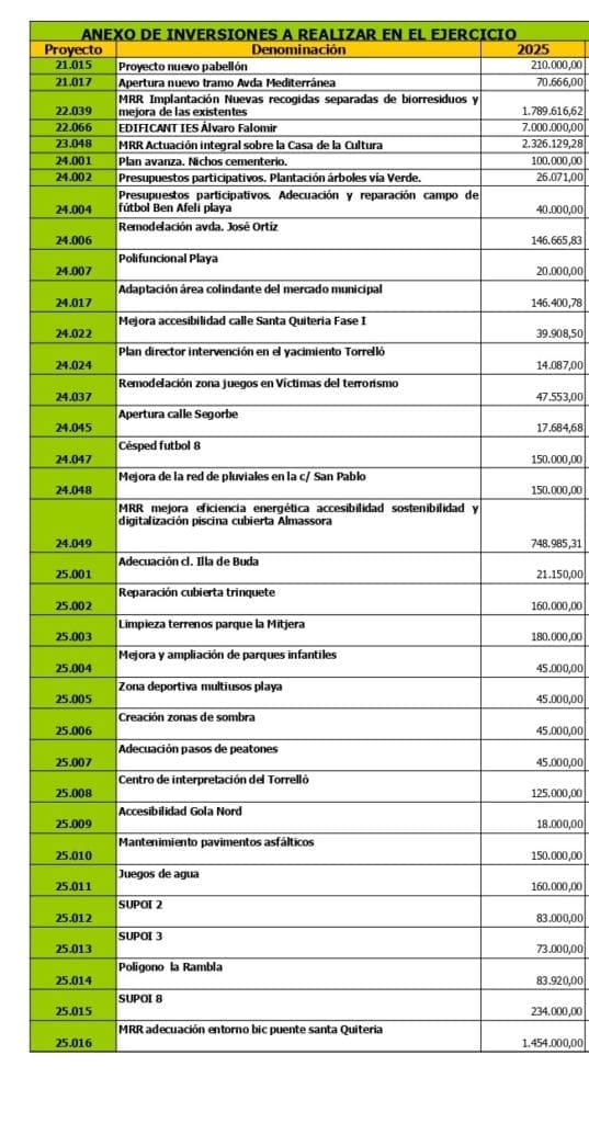También se dará inicio a dos obras importantes para paliar los problemas de inundaciones que se repiten históricamente después de fuertes lluvias y que se localizan en la calle San Pablo y en el entorno de la avenida Generalitat. Se sigue trabajando para acometer otras destacadas actuaciones como son la apertura de un nuevo tramo de la avenida Mediterránea, el proyecto del nuevo pabellón o el polifuncional de la playa. Asimismo, se contempla también una partida para el centro de interpretación del Torrelló.