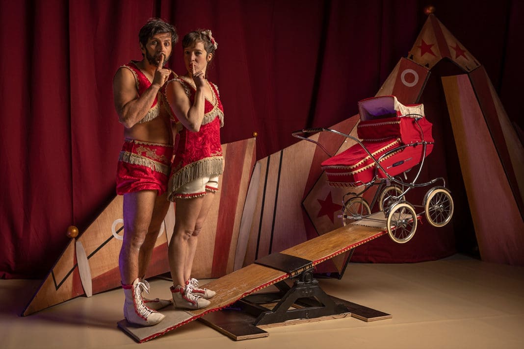 Un dúo de acróbatas y padres primerizos presentarán al público una propuesta de báscula y portes acrobáticos donde se verán saltos frenéticos y agarres de último momento. Parece estar todo controlado, pero el bebé no se lo está poniendo fácil, y el espectáculo tiene que comenzar. Así que no tienen opción: agarran el carrito y salen a la pista.