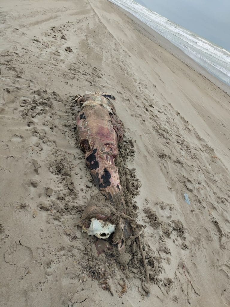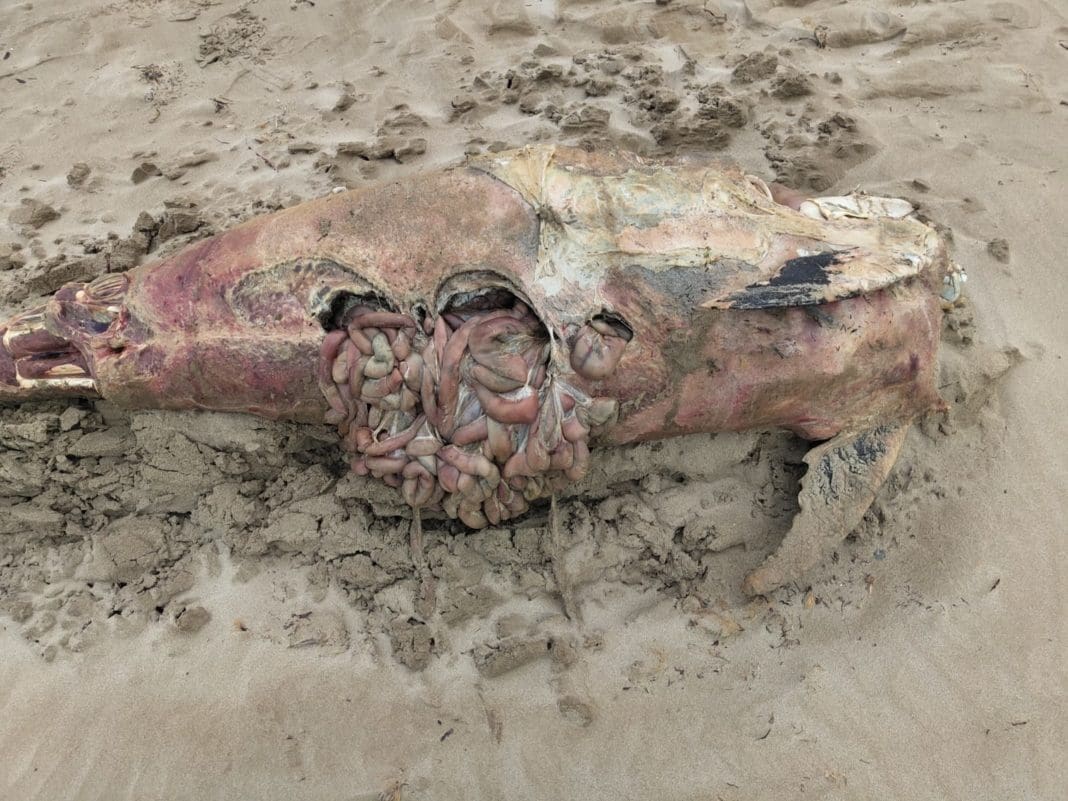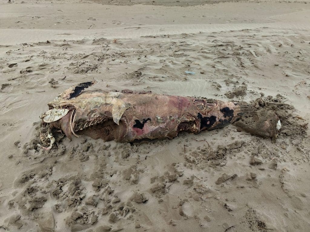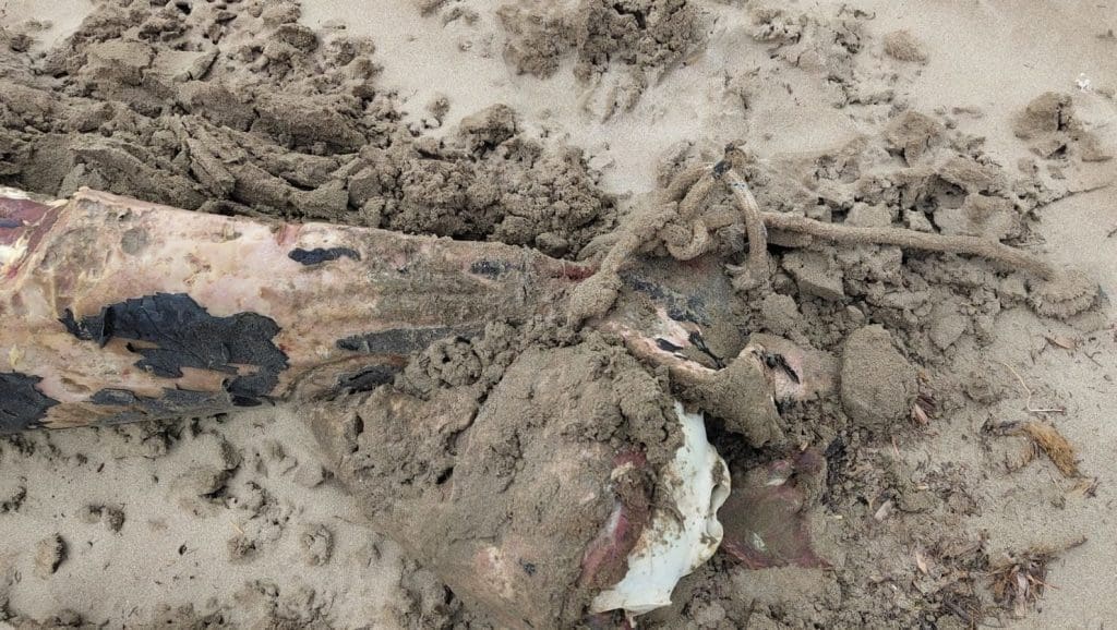 Lo que sorprende es que entre los restos se podía ver todavía fragmentos de cuerda enredada en el cadáver del animal, un hecho que podría hacer pensar en la posibilidad de que se tratara de una captura, de la que luego se hubieran desecho y vuelto a lanzar al mar.
