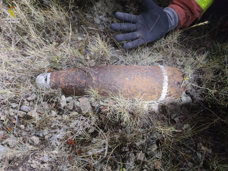 La Guardia Civil de Valencia interviene un proyectil de artillería de 105 milímetros de calibre, semienterrado, con todos los elementos de carga y en perfecto estado de conservación. Fue encontrado por una brigada forestal de bomberos de la Generalitat Valenciana cuando se encontraba realizando labores de extinción del incendio forestal de Bejís-Alcublas.