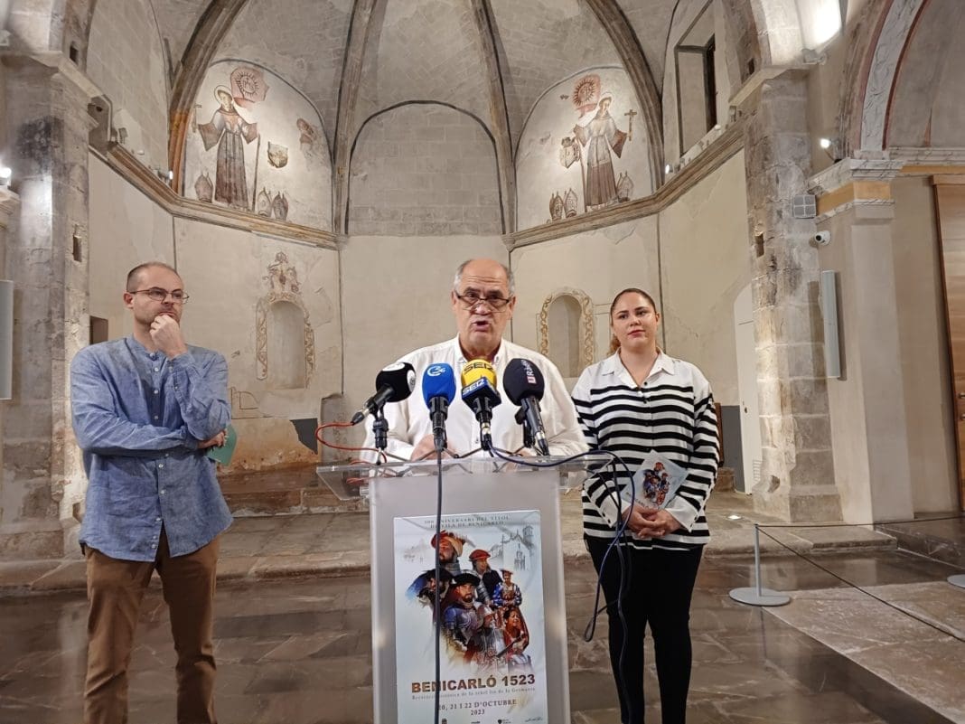 El alcalde de Benicarló, Juanma Cerdá, acompañado de la regidora de Cultura, María Teresa Pellicer, y el historiador Javier Hernández han presentado la programación, que se concentrará los días 20, 21 y 22 de octubre y que tiene una doble derramando divulgativa y didáctica.