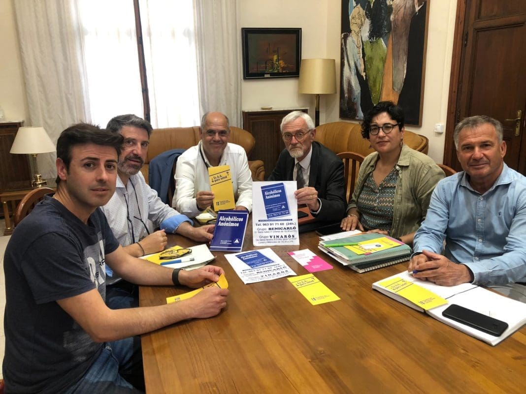 El alcalde, Juanma Cerdá, y los portavoces de los grupos municipales del Ayuntamiento de Benicarló (Álvaro París por el Partido Popular, Juan Pascual Sorlí por Benigazlum-Tot por Benicarló, Ilde Añó por el PSPV-PSOE, Nuria Isern por Compromís y Antonio Fornés por Vox) se han reunido con la asociación Alcohólicos Anónimos de la zona de Benicarló y han mostrado su apoyo a esta entidad que trabaja en el campo de la recuperación personal del alcoholismo.