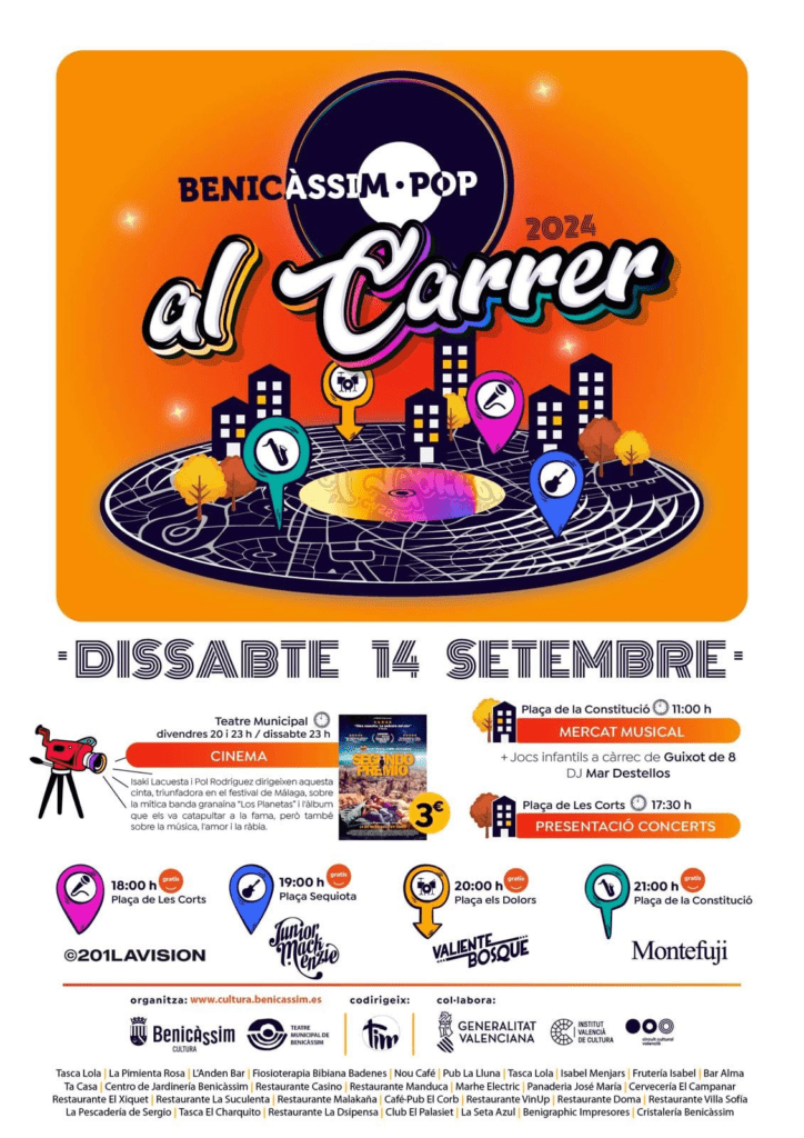 Benicàssim·Pop al Carrer ya está preparado. La música saldrá a las plazas de la localidad este sábado, 14 de septiembre, encadenando las actuaciones correlativas de 201Lavision (plaza Les Corts, 18:00), Junior Mackenzie (plaza Sequiota, 19:00), Valiente Bosque (plaza Els Dolors, 20:00) y Montefuji (plaza Constitució, 21:00).  Cada una de actuaciones tendrá una duración máxima de 45 minutos y todas ellas son de libre acceso.