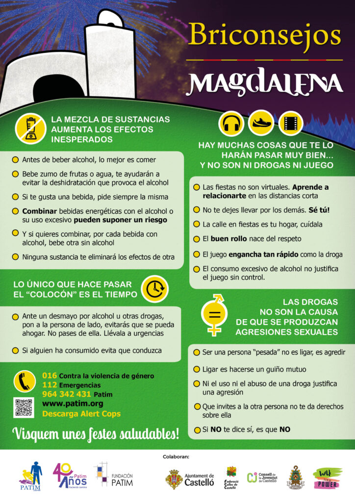 La asociación Patim ha reactivado su campaña ‘Briconsejos’ coincidiendo con el inicio de las fiestas de la Magdalena en Castellón, con el objetivo de reducir riesgos entre adolescentes y jóvenes ante el consumo intensivo de alcohol en celebraciones multitudinarias. La iniciativa se difunde a través de redes sociales y materiales impresos con mensajes breves y directos dirigidos especialmente al público joven.
