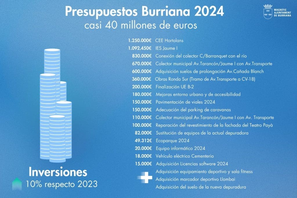 El equipo de Gobierno de Burriana ha centrado sus presupuestos de 2024 en desarrollar proyectos e inversiones para transformar la ciudad. A través de la concejalía de Urbanismo, Obra Pública y Proyectos liderada por Juan Canós, se realizarán numerosos proyectos entre los que destacan inversiones importantes en los centros educativos IES Jaume I y CEE Hortolans con el objetivo de mejorar las infraestructuras educativas en el municipio. En este sentido, tras la resolución del contrato con la empresa adjudicataria encargada de construir el nuevo IES Jaume I, se espera poder reanudar las obras que llevan paralizadas más de 18 meses durante el año próximo.