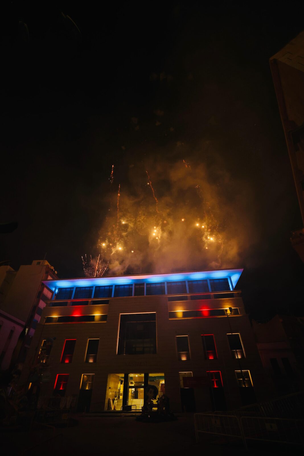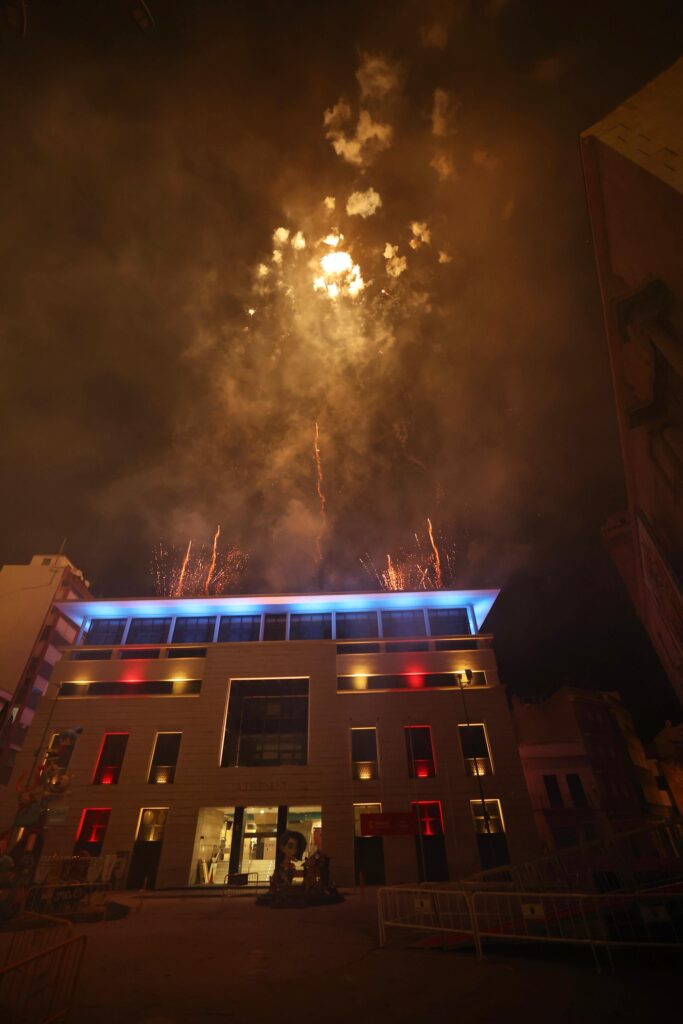 El momento culminante de la jornada tuvo lugar alrededor de las 21:00 horas con el encendido simultáneo de más de 1.200 metros de ‘traca correguda’. El recorrido se inició en las calles La Carrera, Raval, Sant Vicent y calle Mayor, confluyendo todas ellas en un castillo de fuegos artificiales disparado desde la parte superior del edificio consistorial, ofreciendo una estampa visual de gran impacto en el corazón del municipio.