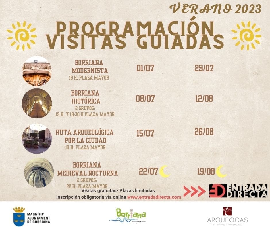 También se realizarán recorridos guiados por diferentes lugares relevantes de la ciudad y de diferentes temáticas que permiten tanto a los locales como a los visitantes en verano, conocer la historia de Burriana y su patrimonio cultural. Las visitas guiadas tienen diferentes temáticas para poder conocer la ciudad, como punto de inicio desde la Plaza Mayor en todas ellas.