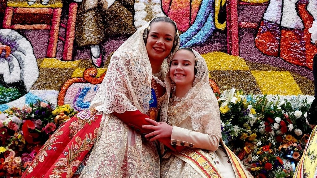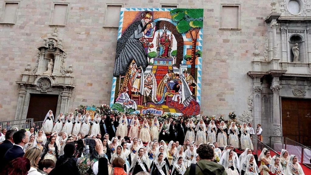 Ante el tapiz fallero confeccionado artesanalmente mediante la técnica del «paperet», de nuevo obra del artista local Juan Dualde junto a la colaboración de la Federació de Falles de Burriana, los falleros y falleras de todas las edades han depositado sus ramos en honor a la patrona de la ciudad.