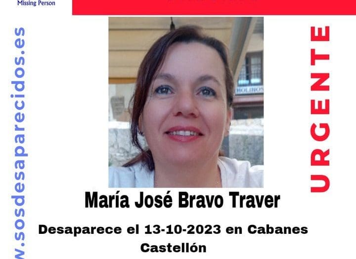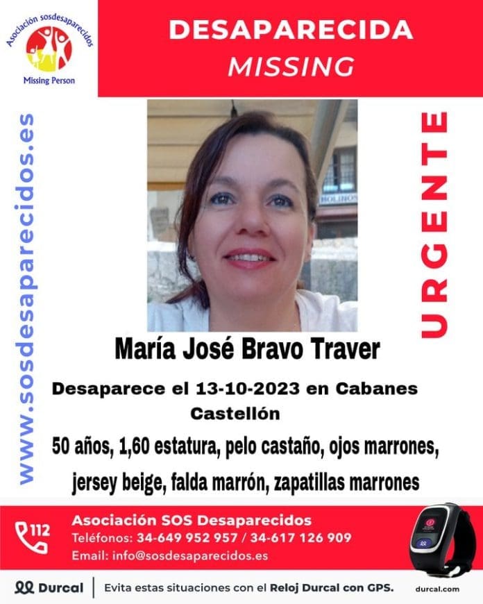 María José Bravo Traver tiene 50 años, miden 1,60 de estatura, tiene el pelo castaño y los ojos marrones, y en el momento de la desaparición, llevaba un jersey beige, una falda marrón y unas zapatillas marrones.