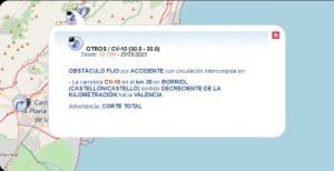 Un camión volcado con el depósito incendiado corta la circulación en la CV-10 en Borriol, sentido Valencia