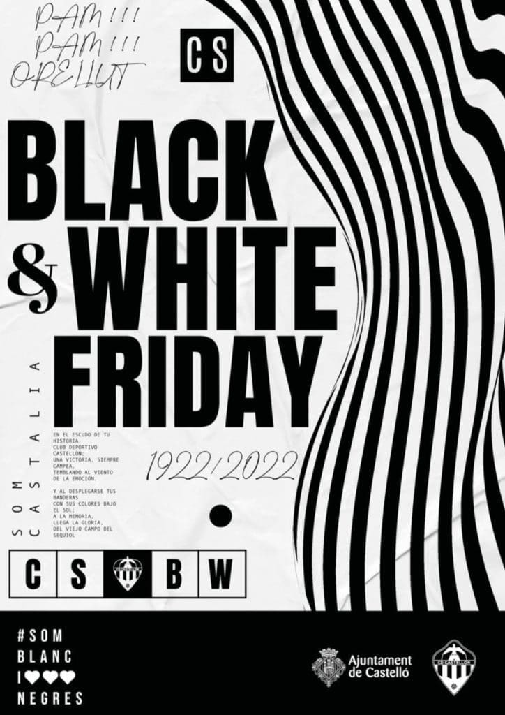 Con un juego de palabras que pretende aunar sentimiento albinegro y campaña comercial, Castellón ha presentado este lunes la campaña black and white friday. Una iniciativa comercial pero también estrechamente vinculada al soporte y la afición del CD Castellón en la que del 24 hasta el 30 de noviembre se sortearán premios deportivos en los comercios adheridos que irán desde camisetas firmadas por los jugadores hasta mochilas del club deportivo.