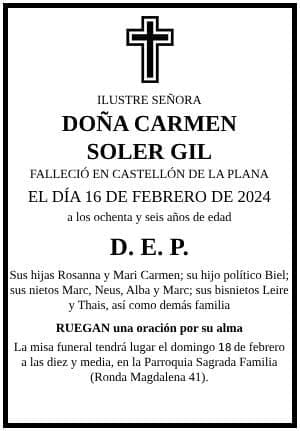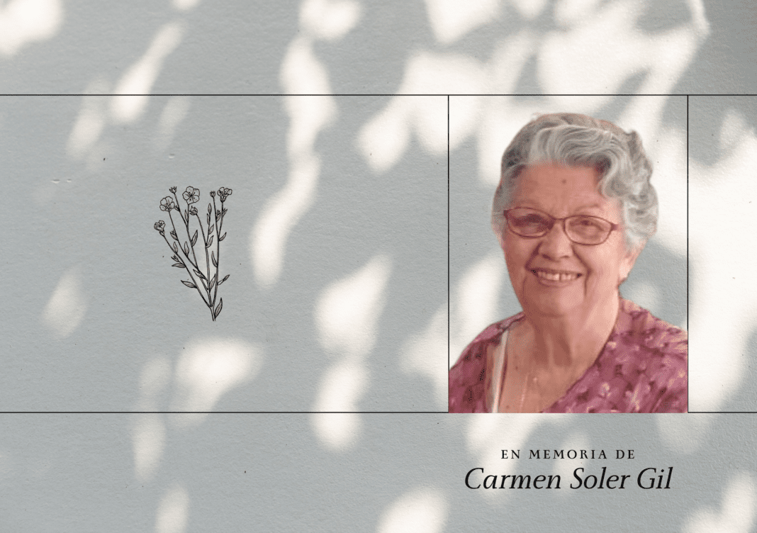 Con la sencillez y la discreción marcando una vida dedicada a los demás, Carmen Soler Gil, “Carmencita, la bordadora de la Ereta” para quienes la conocieron de joven, enseñando a bordar a decenas de chicas que se hacían sus ajuares, se ha ido como vivió: sabiendo estar en su sitio.