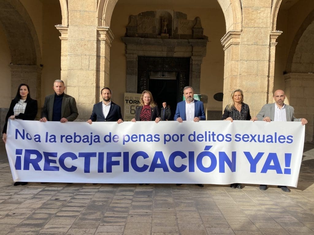 La portavoz del Partido Popular en el Ayuntamiento de Castellón, Begoña Carrasco, junto a los concejales de su grupo ha desplegado hoy una pancarta a las puertas del Ayuntamiento de la capital, solicitando la rectificación inmediata de la Ley del ‘Solo Sí’, que va a beneficiar a 30 condenados por delitos sexuales en la provincia de Castellón y ya ha rebajado la pena a más de 115 en toda España.