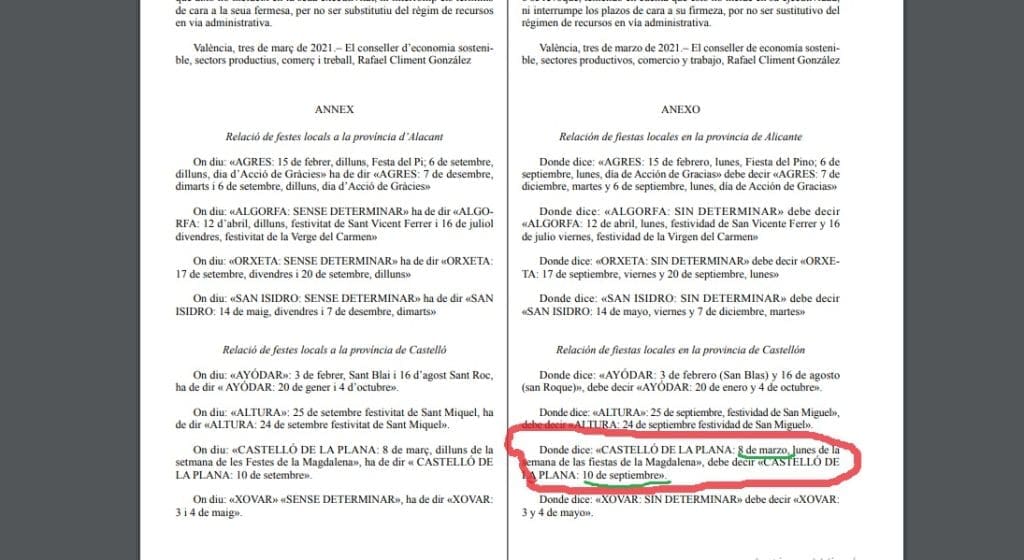 La Conselleria de Economía Sostenible, Sectores Productivos, Comercio y Trabajo publica la resolución por la que se modifica el anexo de la Resolución de 23 de diciembre de 2020, por la que se aprobó el calendario de fiestas locales, retribuidas y no recuperables en el ámbito de la Comunitat Valenciana, para el año 2021 y en el apartado de la provincia de Castellón indica claramente la variación en la capital de la Plana: «Donde dice: «CASTELLÓ DE LA PLANA: 8 de marzo, lunes de la semana de las fiestas de la Magdalena», debe decir «CASTELLÓ DE LA PLANA: 10 de septiembre».