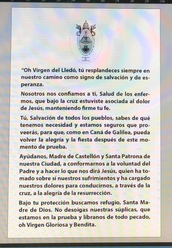 El document recorda també totes les mesures preventives que s’han pres des de l’església, per això, a la capital de la Plana, la basílica de Lledó també se suma a acatar estes directrius i a més, a partir d’este dissabte repartirà unes estampetes amb la imatge de la Patrona de Castelló i una oració, adaptada a demanar-li protecció a la Mare de Déu del Lledó davant estes exepcionals circustàncies perquè els fidels puguen resar-li.