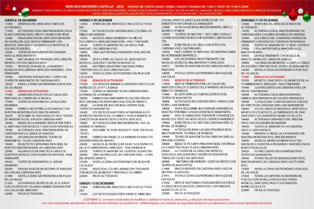 Castelló acogerá el Mercat Nadalenc del 8 al 11 de diciembre. Una propuesta que contribuirá a dinamizar el centro de la ciudad y que ofrece decenas de actividades para un público familiar y una amplia variedad de productos en las paradas instaladas.