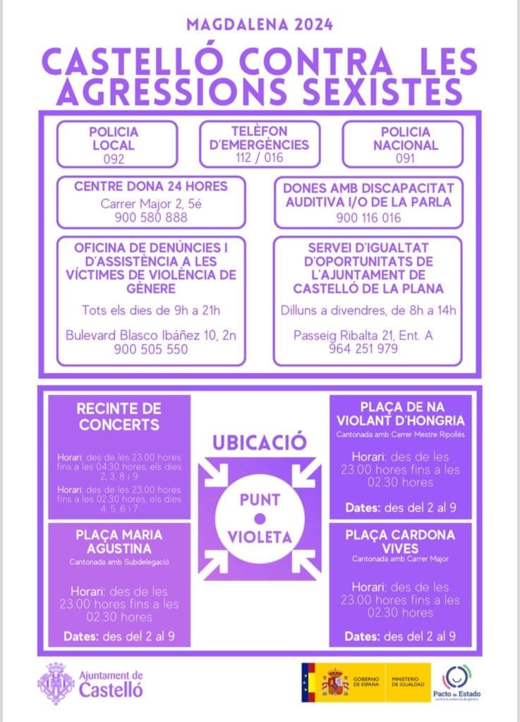 El Ayuntamiento de Castelló instalará cinco ‘Puntos Violeta’ durante las fiestas de la Magdalena, que estarán ubicados según ha explicado el portavoz del equipo de gobierno, Vicent Sales, “en la plaza María Agustina; plaza Cardona Vives; plaza Na Violant y otro en la zona de conciertos”.