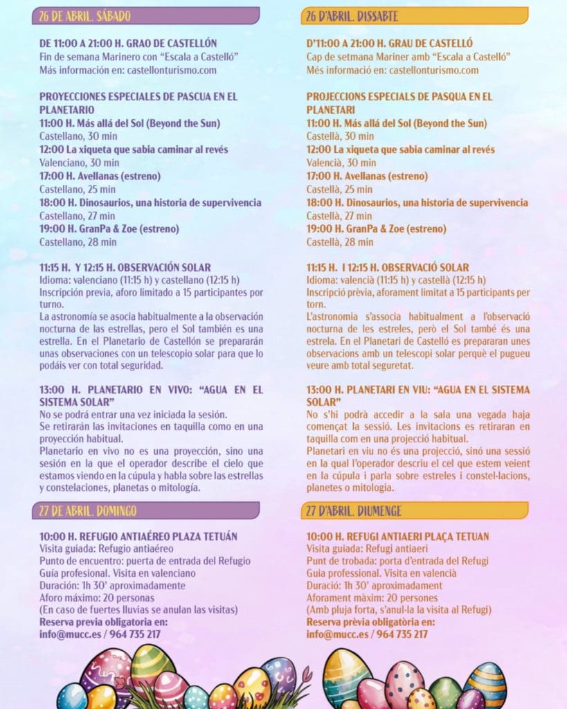 En cuanto a la programación de Pascua, las propuestas que van desde las actividades lúdicas, a las emblemáticas procesiones pero que también contemplan talleres, conciertos, rutas y visitas teatralizadas en distintos espacios entre los que destacan, por ejemplo, los barrios o el distrito marítimo del Grau de Castelló.