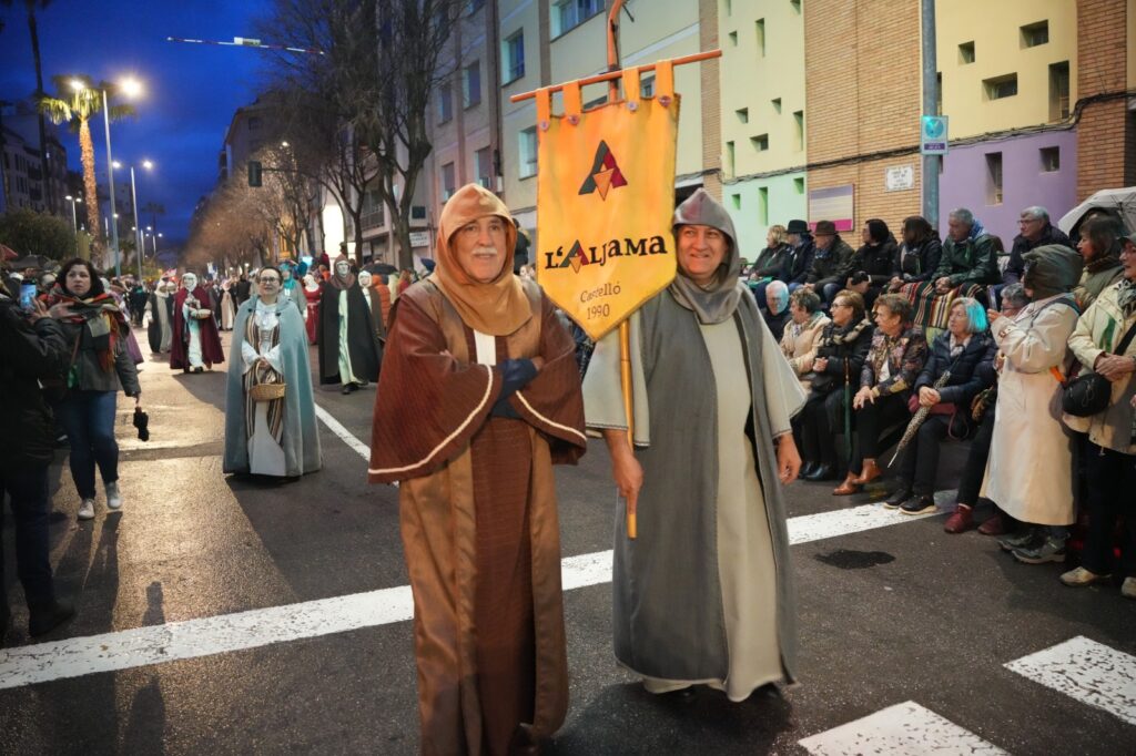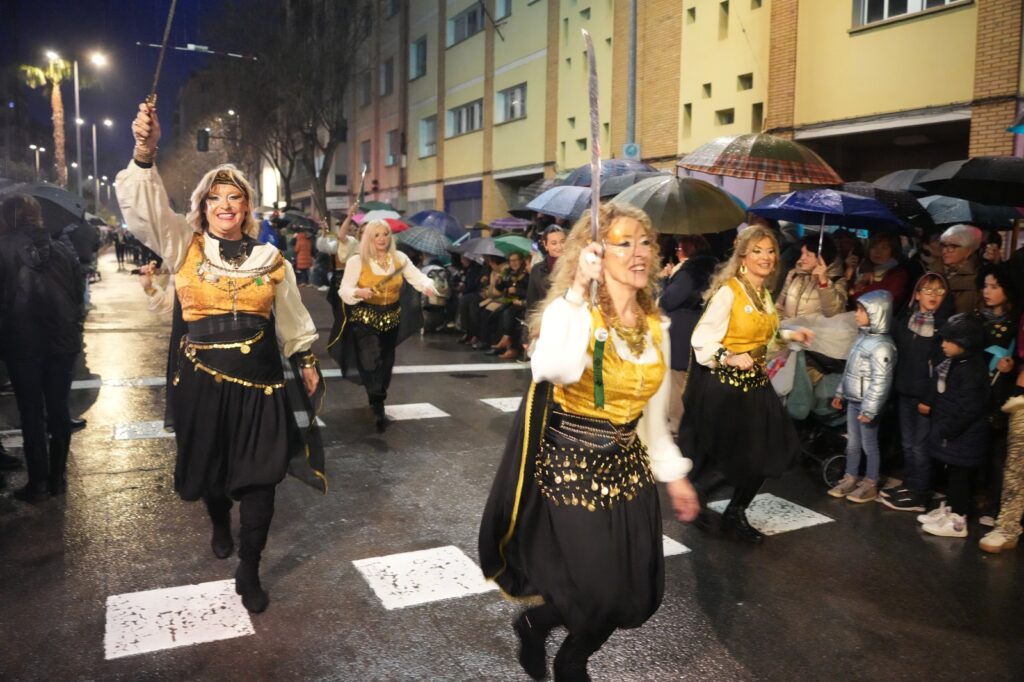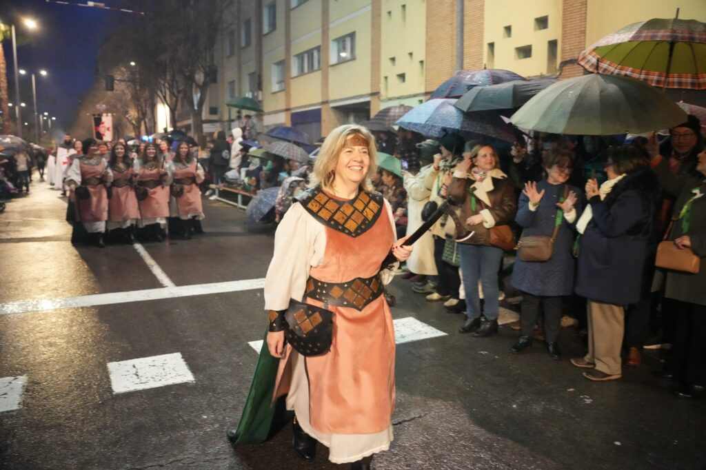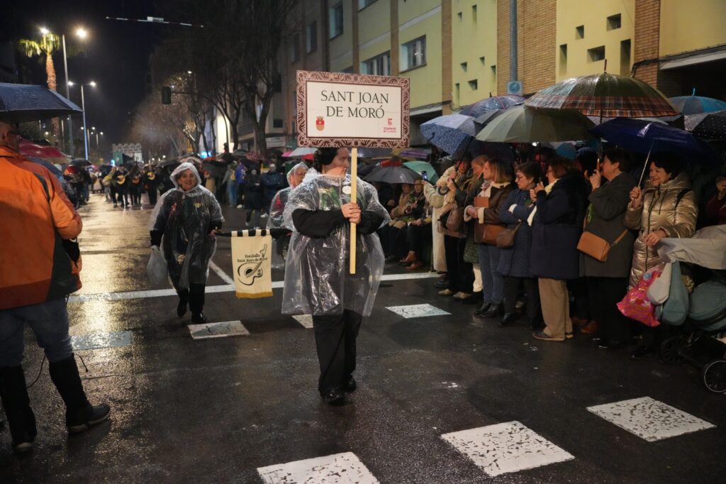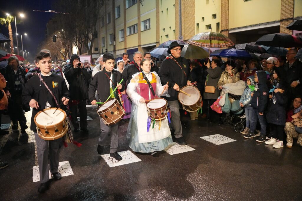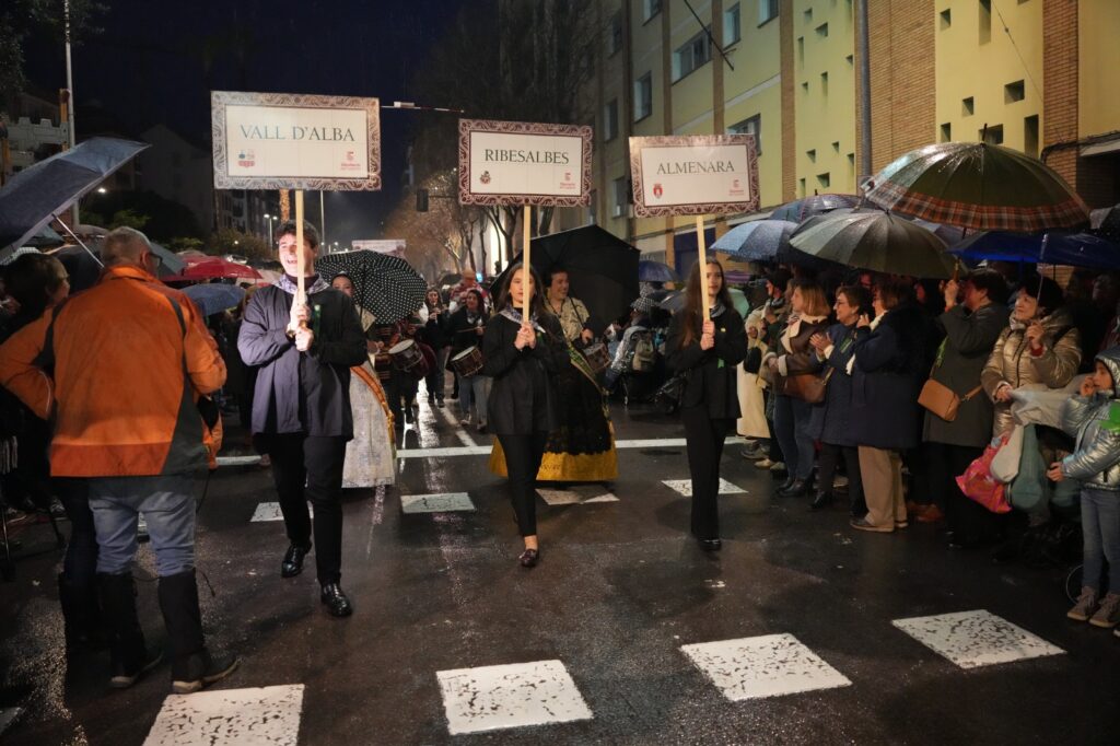 La lluvia intermitente no impidió que el Pregón de la Magdalena salvara una de las citas centrales de las fiestas fundacionales de Castellón. Aunque el desfile perdió parte de su formato habitual, festeros y castellonenses llenaron las calles para sostener un acto marcado por la incertidumbre y la emoción.
