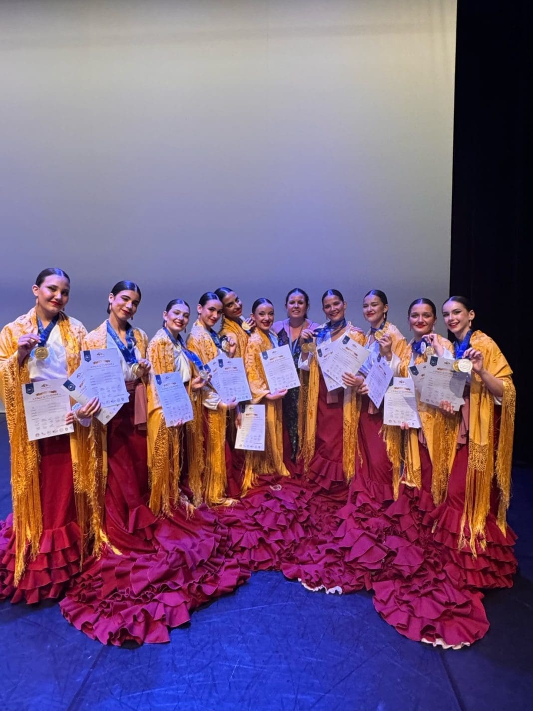 Las alumnas del centro burrianense Ainhoa Salom, Candela Ripollés, Clara Safont, Gala Cortés, Julia Arias, Laura García, María Izquierdo, Marta Navarro, Paula de Selva y Valeria Abaunza interpretaron la coreografía “Revuelo”, dentro de la categoría de National Folklorique. La composición flamenca, bailada con bata de cola y mantón, les sirvió para obtener el máximo reconocimiento en su categoría.