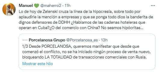 Los comentarios entre lo ‘ético y lo económico’ se han encendido en las redes sociales tras la petición de este martes del presidente ucraniano, de romper relaciones comerciales con el mercado ruso. Unas declaraciones que incluso han llevado a la empresa Porcelanosa a emitir un comunicado explicando sus exportaciones a Rusia en el último mes.