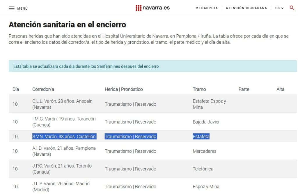 Herido un corredor de 38 años de Castellón, que responde a las iniciales de S.V.N. en el encierro de este 10 de julio. Así lo recoge el parte diario oficial de los servicios sanitarios de Navarra.