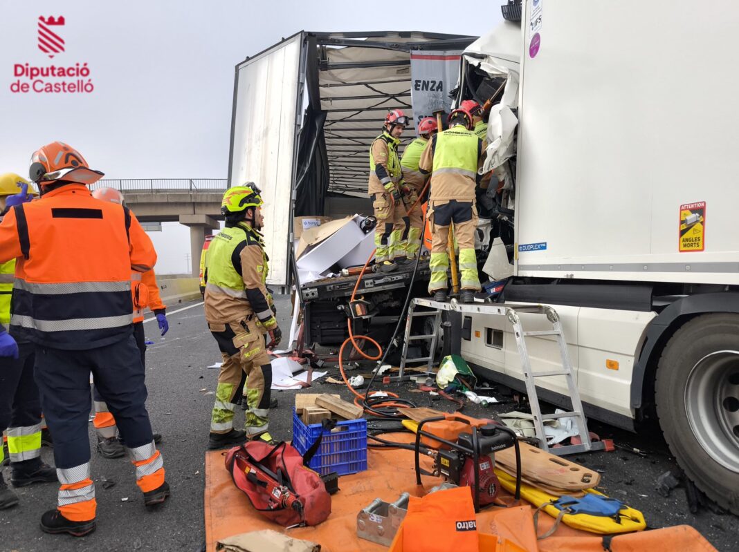 Los bomberos de la Diputación de Castellón están trabajando en la excarcelación del conductor de uno de los camiones implicados en el accidente.