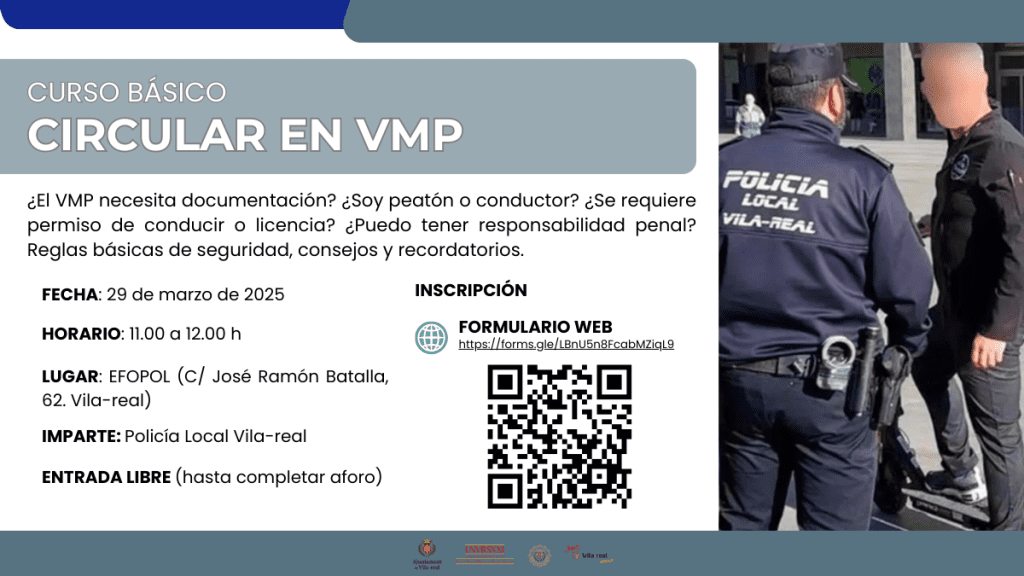 La Policía Local de Vila-real impartirá el próximo sábado 29 de marzo un nuevo curso sobre el uso de los Vehículos de Movilidad Personal (VMP). Se trata de una formación básica a la que puede asistir cualquier usuario de VMP, mayor de 14 años, y que abordará cuestiones básicas que ayuden a mejorar la seguridad de los usuarios de estos vehículos así como de otros conductores y peatones como, por ejemplo, si es necesario algún tipo de documentación, las posibles responsabilidades penales, cómo actuar en caso de verse implicado en un siniestro vial o las reglas básicas de circulación.