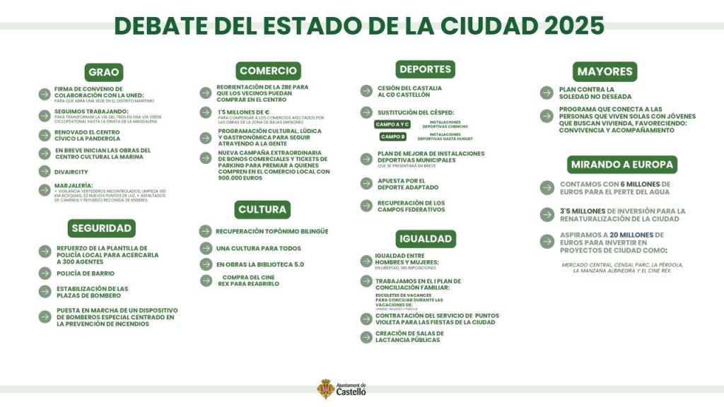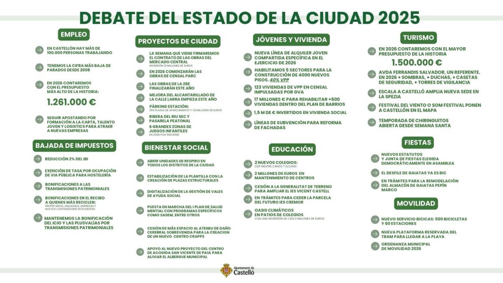 La primera edil presentó también nuevas iniciativas de bienestar social. Entre ellas, destacó la digitalización de la gestión de vales de ayudas sociales. Esto tiene el objetivo de hacer el sistema más rápido y transparente. Para 2026, está previsto el desarrollo de un mapa de recursos de respiro en los seis distritos de Castellón. Este permitirá coordinar mejor los servicios para las familias cuidadoras.