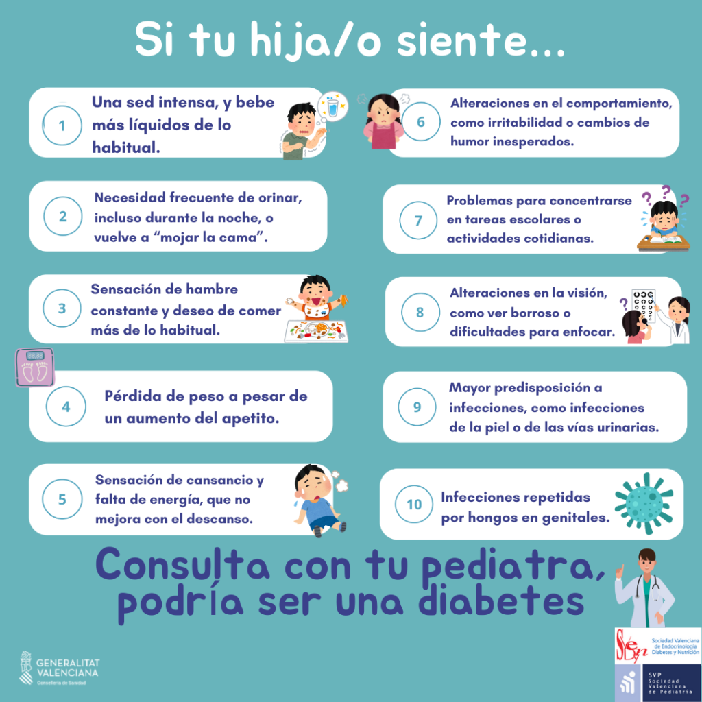 Asimismo, para potenciar el diagnóstico precoz, Sanidad ha distribuido en los centros sanitarios un decálogo con signos de alerta dirigida a la población en general, y en concreto a padres y madres, para facilitar la identificación de posibles síntomas y optimizar así el diagnóstico temprano de la diabetes tipo 1 en los menores. Esta guía se ha elaborado en colaboración con las sociedades científicas y en respuesta a la propuesta de la Asociación Valenciana de Diabetes.