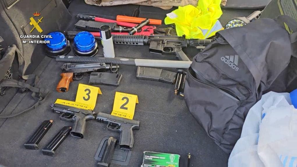 Al registrar los coches los guardias civiles hallaron un fusil, subfusil y dos pistolas todas ellas municionadas. También chalecos antibalas, chalecos con el emblema de Guardia Civil y elementos policiales como linternas y rotativos luminosos.