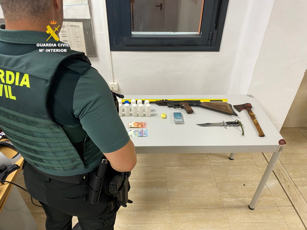 Al llegar al lugar, escucharon ruidos procedentes de una zona arbolada. En el interior de la propiedad los agentes hallaron una bolsa con 10 gramos de cocaína, 12 botes de metadona, y una báscula para pesaje. Además, encontraron un machete militar, un hacha, una carabina de aire comprimido, bolsas de plástico con recortes y 30 euros en efectivo.