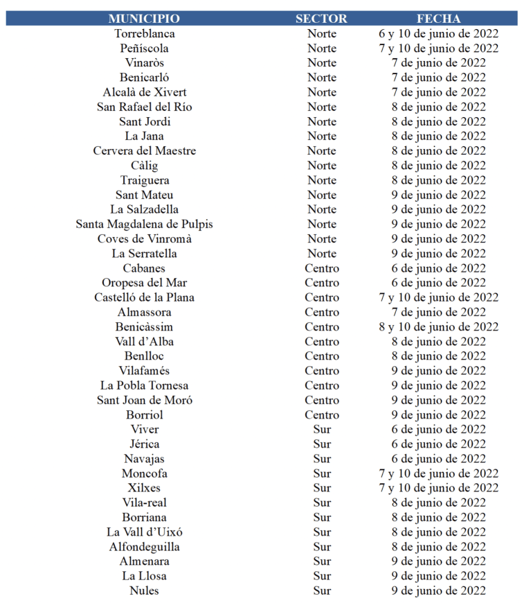 Los municipios que entre el lunes y el viernes de la próxima semana se beneficiarán de los tratamientos terrestres que realiza la Diputación Provincial en las zonas de marjal e inundadas del Medio Natural serán los siguientes: Vinaròs, Benicarló, Peñíscola, Torreblanca, Alcalà de Xivert, San Rafael del Río, Sant Jordi, La Jana, Cervera del Maestre, Càlig, Traiguera, Sant Mateu, La Salzadella, Santa Magdalena de Pulpis, Coves de Vinromà, La Serratella, Cabanes, Oropesa del Mar, Castelló de la Plana, Almassora, Borriana, Benicàssim, Vall d’Alba, Benlloc, Vilafamés, La Pobla Tornesa, Borriol, Sant Joan de Moró, Vila-real, Alfondeguilla, Vall d’Uixó, Almenara, La Llosa, Nules, Moncofa, Xilxes, Viver, Jérica y Navajas. En los casos de Torreblanca, Peñíscola, Castelló de la Plana, Benicàssim, Moncofa y Xilxes, dada la especial incidencia de la plaga en estos términos, se ampliará a dos el número de jornadas de tratamientos terrestres.
