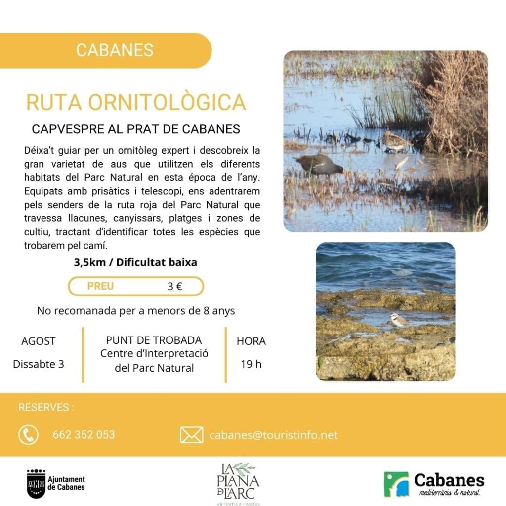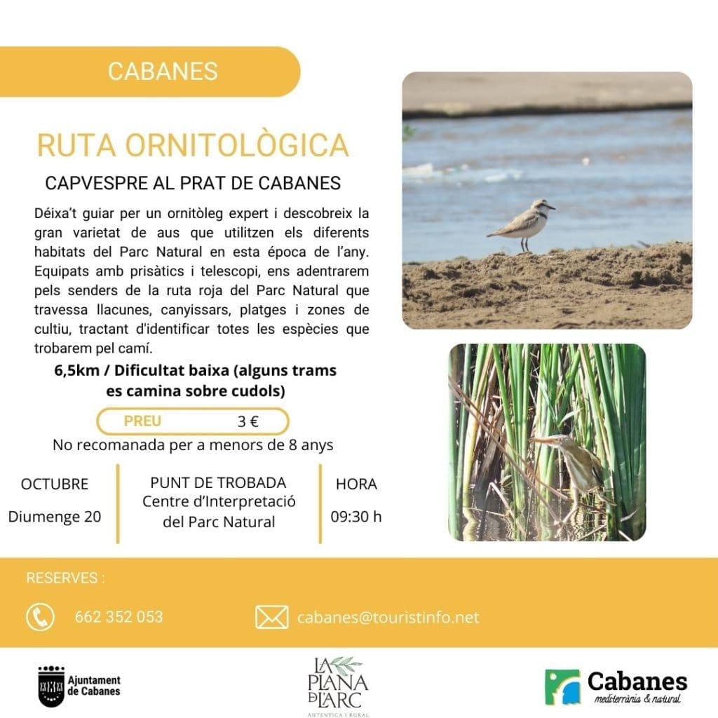 La concejalía de Turismo del Ayuntamiento de Cabanes, en colaboración con la Oficina de Turismo local, ha puesto en marcha una novedosa promoción de la variada fauna que habita en los parajes locales. De este modo, se organizan cuatro excursiones repartidas durante los próximos meses para otear y disfrutar de la riqueza y la diversidad de aves presente en espacios como el Prat Cabanes-Torreblanca o los campos repartidos por el término municipal de la localidad.