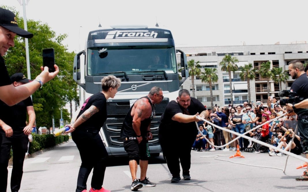 El competidor burrianense de Fuerza, Roberto Perelló, ha conseguido arrastrar a lo largo de 20 metros con éxito dos camiones, sumando un total de 34.820 kilos, batiendo con creces el récord europeo.