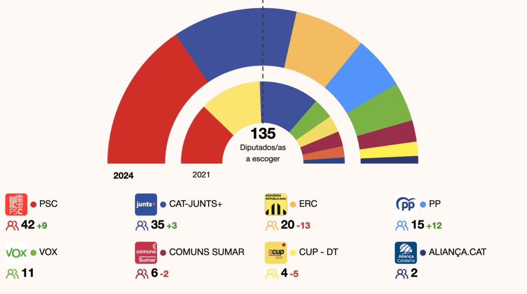 En contraste, los Comunes y la CUP ven reducida su representación en el parlamento, con 6 y 4 escaños respectivamente. Además, Aliança Catalana hace su entrada en el Parlamento con 2 diputados, mientras que Ciudadanos desaparece del escenario político catalán tras estos resultados.