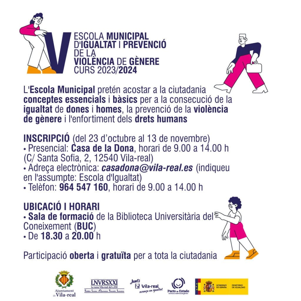 Se puede formalizar la inscripción de manera presencial, en la Casa de la Dona, en horario de 9.00 a 14.00 h (C/ Santa Sofia, 2); a través del correo electrónico casadona@vila-real.es , indicando en el asunto Escuela de Igualdad; o en el teléfono 964 547 160, horario de 9.00 a 14.00 h.