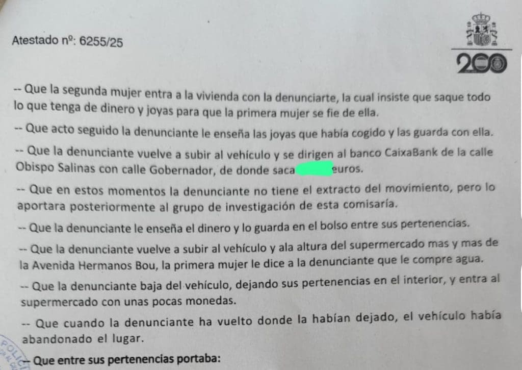 Según el testimonio de su familia, todo comenzó cuando se le acercó una mujer con acento gallego que le pidió indicaciones sobre una calle. Aunque la víctima no supo responder, “casualmente” apareció otra mujer que dijo conocer el lugar. Ambas la envolvieron en una historia sobre un supuesto décimo premiado de la ONCE. Además la estafadora pidió ayuda a la víctima alegando que tenía miedo que la timara alguien. Por eso, le ofrecieron 30.000 euros si les ayudaba a gestionarlo.
