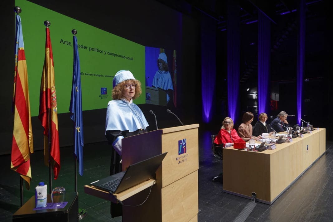 Rosalía Torrent Esclapés, catedrática de Estética y Teoría de las Artes del Departamento de Historia, Geografía y Arte, ha sido la encargada de impartir la lección inaugural de este curso académico 2024-2025 que ha llevado por título «Arte, poder político y compromiso social», en la que ha reflexionado sobre la trascendencia política que tiene el arte y la importancia que esta actividad se realice libre de todo control político. «Esta es una cuestión vital para el arte y también para mantener la buena salud de las sociedades democráticas», ha apuntado.