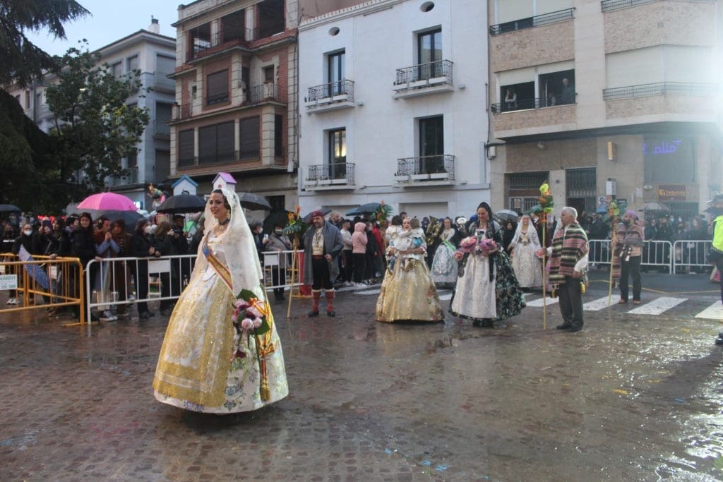 Las 18 comisiones falleras de la ciudad se han dado cita junto al colegio Salesianos, desde donde se ha iniciado el desfile por las principales calles de la ciudad hasta llegar a la plaça Major. De forma escalonada, han ido accediendo al escenario y entregando sus flores como ofrenda a la patrona de la ciudad, la Mare de Déu de la Misericòrdia, bajo el magnífico tapiz diseñado por el artista local Juan Dualde, inspirado en la antigua ciudad amurallada de Burriana y emplazado en la fachada de la basílica de El Salvador.