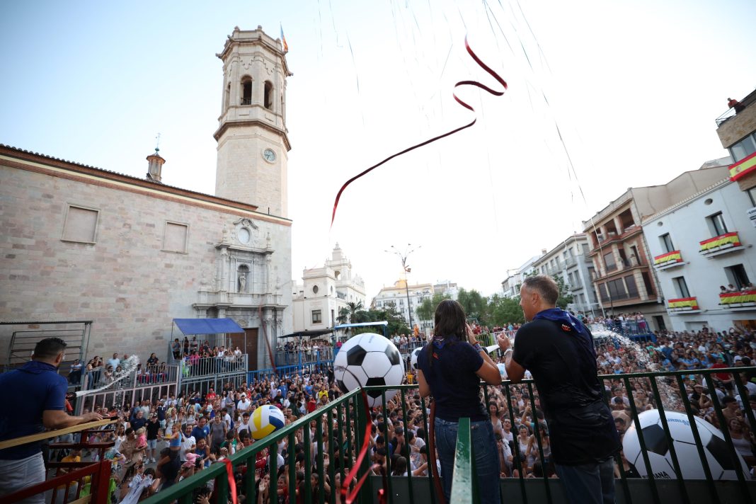 Decenas de peñas recorrieron las calles acompañadas por charangas, en un ambiente festivo que culminó en el balcón del ayuntamiento. Desde allí, se lanzaron pañuelos, mochilas y pelotas gigantes, mientras un DJ animaba la tarde. El momento clave llegó con el encendido del Esclafit, símbolo que marca el inicio oficial de las fiestas patronales.