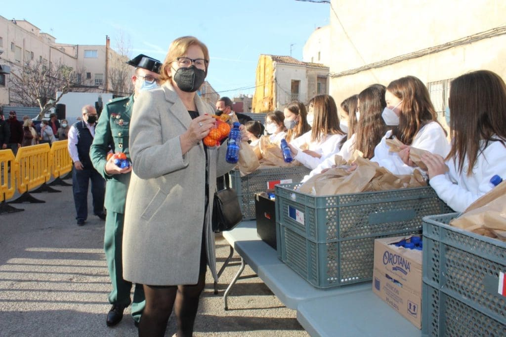 Así, la alcaldesa de Burriana, Maria Josep Safont, la concejala de Fiestas, Lluïsa Monferrer, y las Reinas Falleras de 2022, Sandra Candau y Ana Giménez, han sido las primeras en acercarse para recoger el almuerzo en envases individuales que las Cortes de Honor han ofrecido a todas las personas, y también se han repartido mallas de clementinas de la Plana, todo ello siguiendo el protocolo de distancia de seguridad y mascarilla.