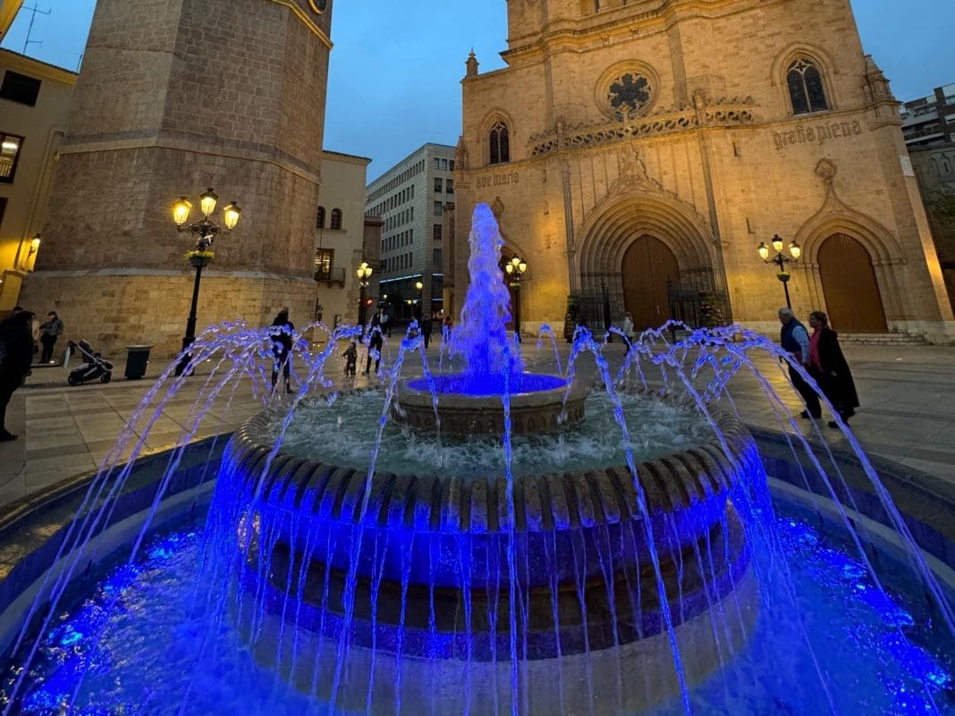 La fuente de la plaza Mayor de Castellón se ilumina de color azul por el Día Mundial del Agua